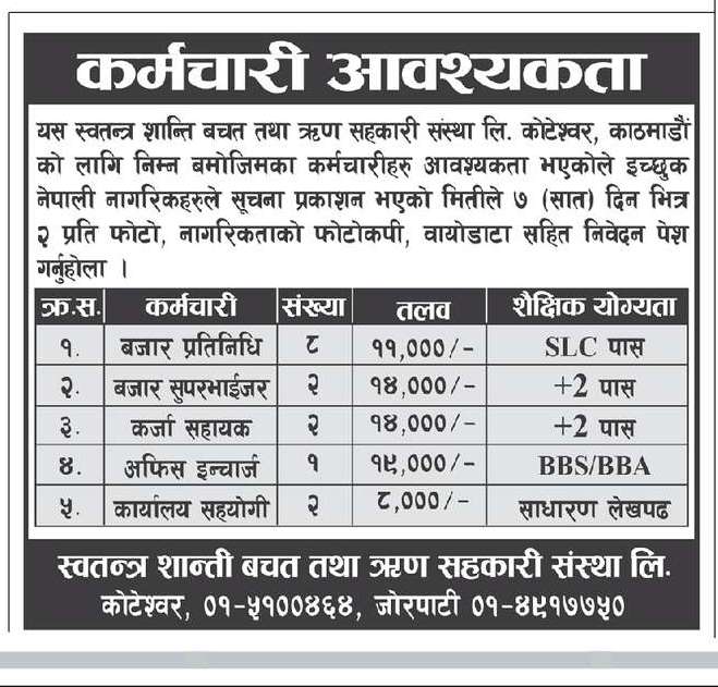 स्वतन्त्र शान्ति सहकारीमा जागिर खुल्यो