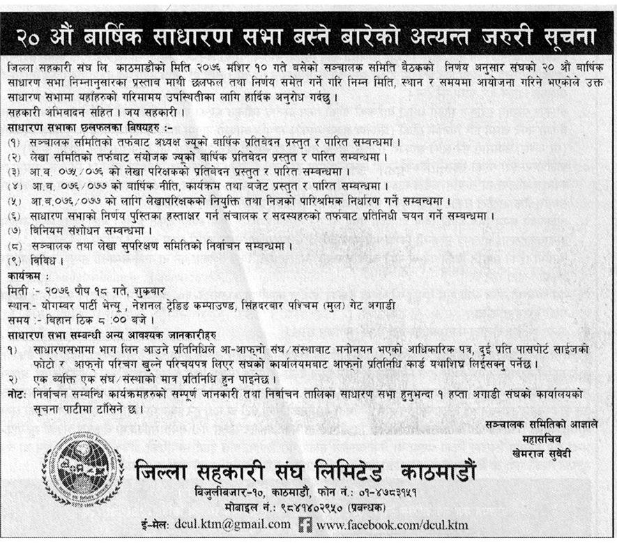 जिल्ला सहकारी संघ, काठमाडौंको २० औं साधारणसभा सम्बन्धी अत्यन्त जरुरी सूचना