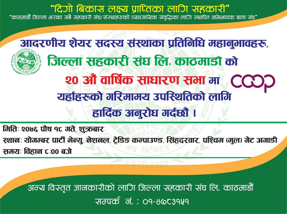 जिल्ला सहकारी संघ, काठमाडौंको २० औं साधारणसभा सम्बन्धी अत्यन्त जरुरी सूचना