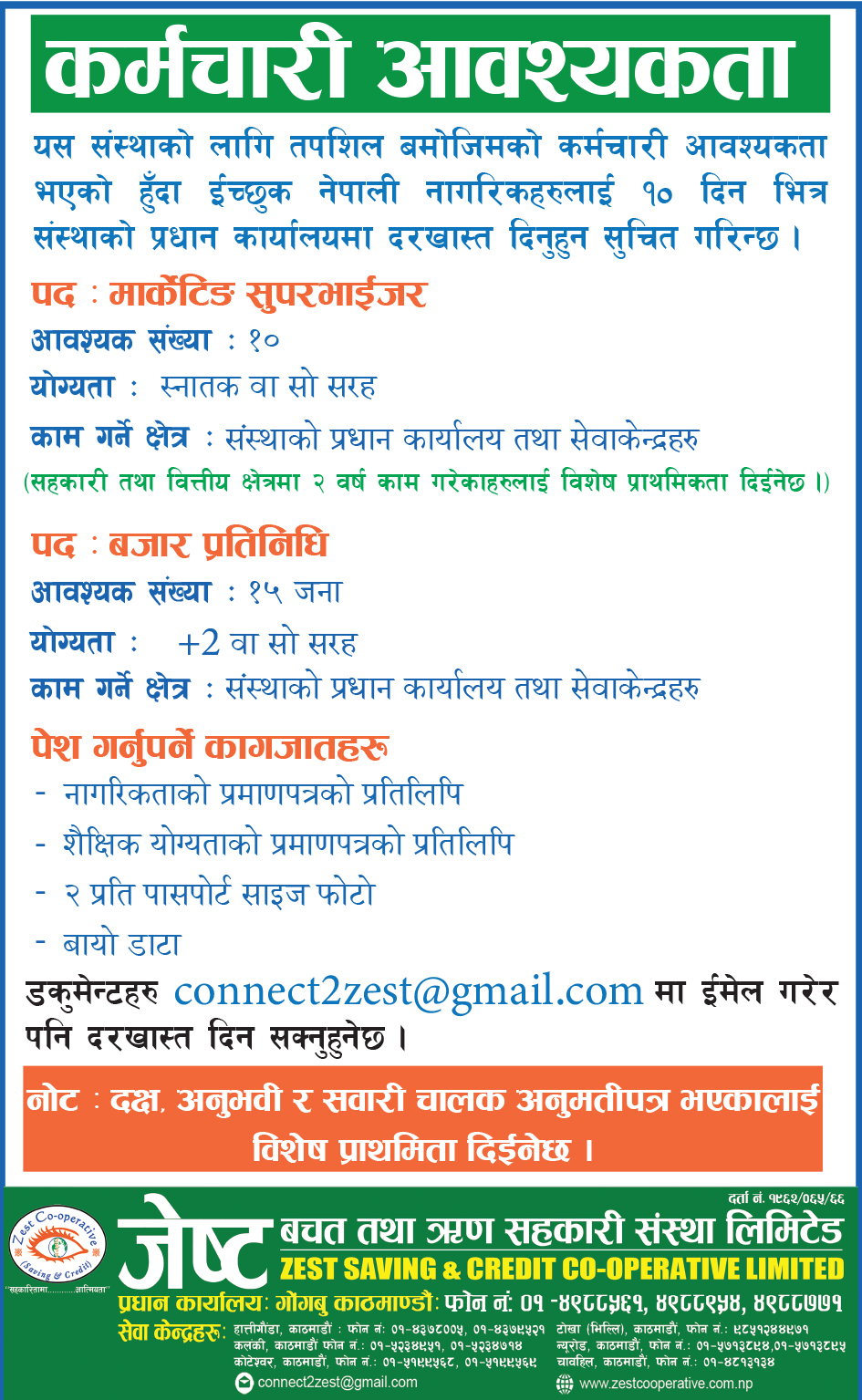 काठमाडौंको गोंगबुमा प्रधान कार्यालय रहेको जेष्ट बचत तथा ऋण सहकारी संस्था लि.लाई कर्मचारी आवश्यकता