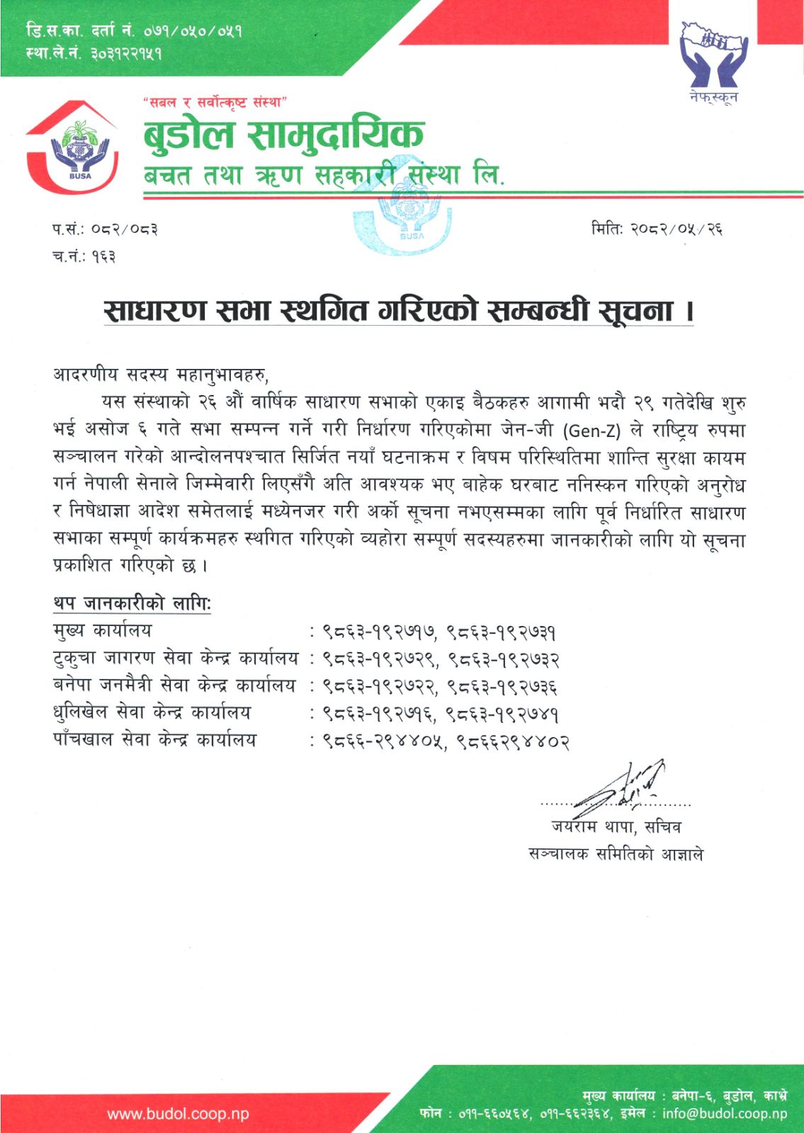 जेन जीले राष्ट्रिय रुपमा सञ्चालन गरेको आन्दोलनपश्चात सिर्जित नयाँ घटनाक्रम र विषम परिस्थितिमा शान्ति सुरक्षा कायम गर्न नेपाली सेनाले जिम्मेवारी लिएसँगै अति आवश्यक भए बाहेक घरबाट ननिस्कन गरिएको अनुरोध र निषेधाज्ञा आदेश समेतलाई मध्येनजर गरी अर्को सूचना नभएसम्मका लागि पूर्व निर्धारित साधारण सभाका सम्पूर्ण कार्यक्रमहरु स्थगित गरिएको संस्थाका सचिव जयराम थापाले जानकारी दिए ।