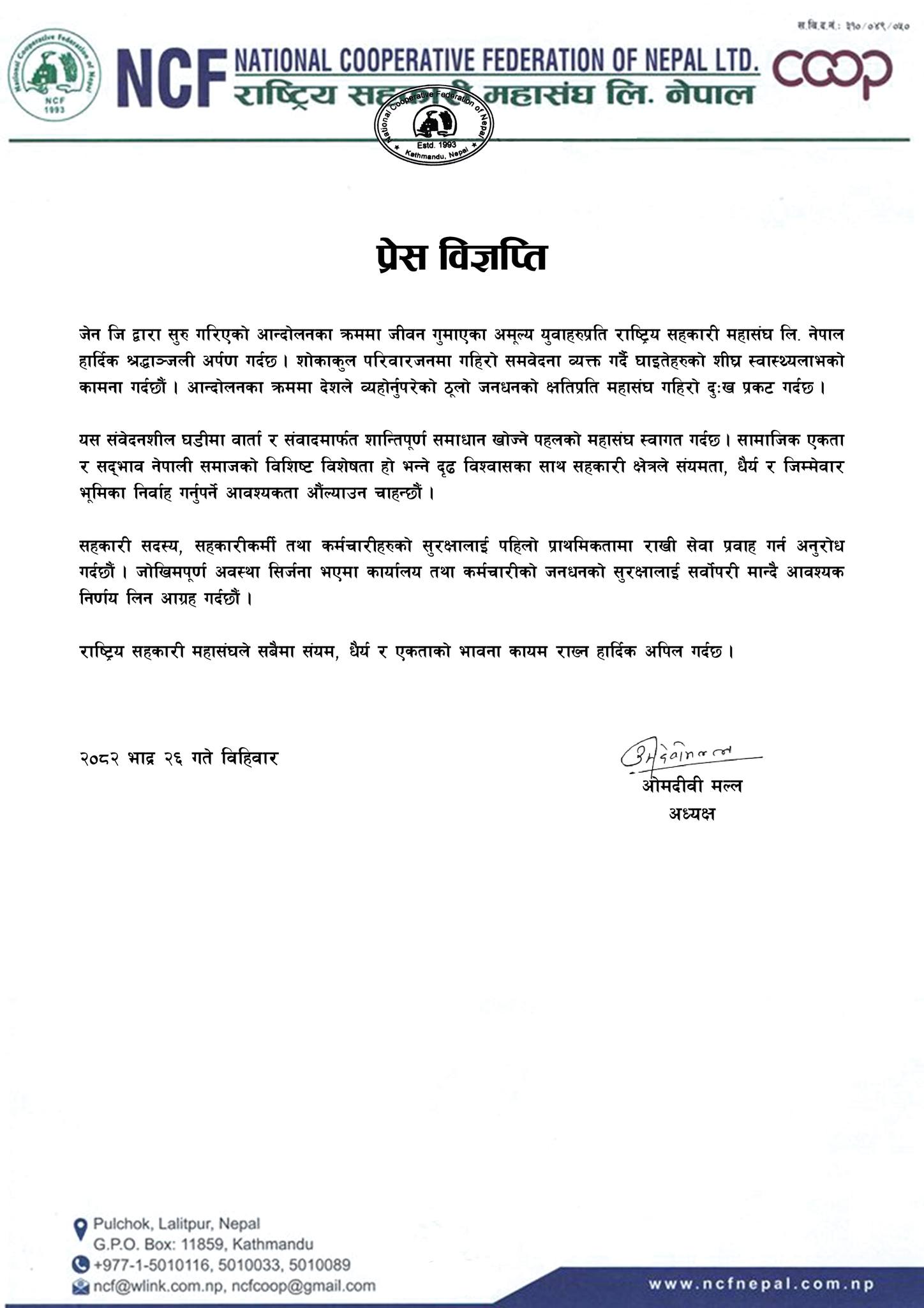 जारी विज्ञप्तिमा भनिएको छ, ‘जेन जिद्वारा सुरु गरिएको आन्दोलनका क्रममा जीवन गुमाएका अमूल्य युवाहरुप्रति राष्ट्रिय सहकारी महासंघ नेपाल हार्दिक श्रद्धाञ्जली अर्पण गर्दछ । शोकाकुल परिवारजनमा गहिरो समवेदना व्यक्त गर्दै घाइतेहरुको शीघ्र स्वास्थ्यलाभको कामना गर्दछौं । आन्दोलनका क्रममा देशले व्यहोर्नुपरेको ठूलो जनधनको क्षतिप्रति महासंघ गहिरो दुःख प्रकट गर्दछ । यस संवेदनशील घडीमा वार्ता र संवादमार्फत शान्तिपूर्ण समाधान खोज्ने पहलको महासंघ स्वागत गर्दछ । सामाजिक एकता र सद्भाव नेपाली समाजको विशिष्ट विशेषता हो भन्ने दृढ विश्वासका साथ सहकारी क्षेत्रले संयमता, धैर्य र जिम्मेवार भूमिका निर्वाह गर्नुपर्ने आवश्यकता औंल्याउन चाहन्छौं ।’