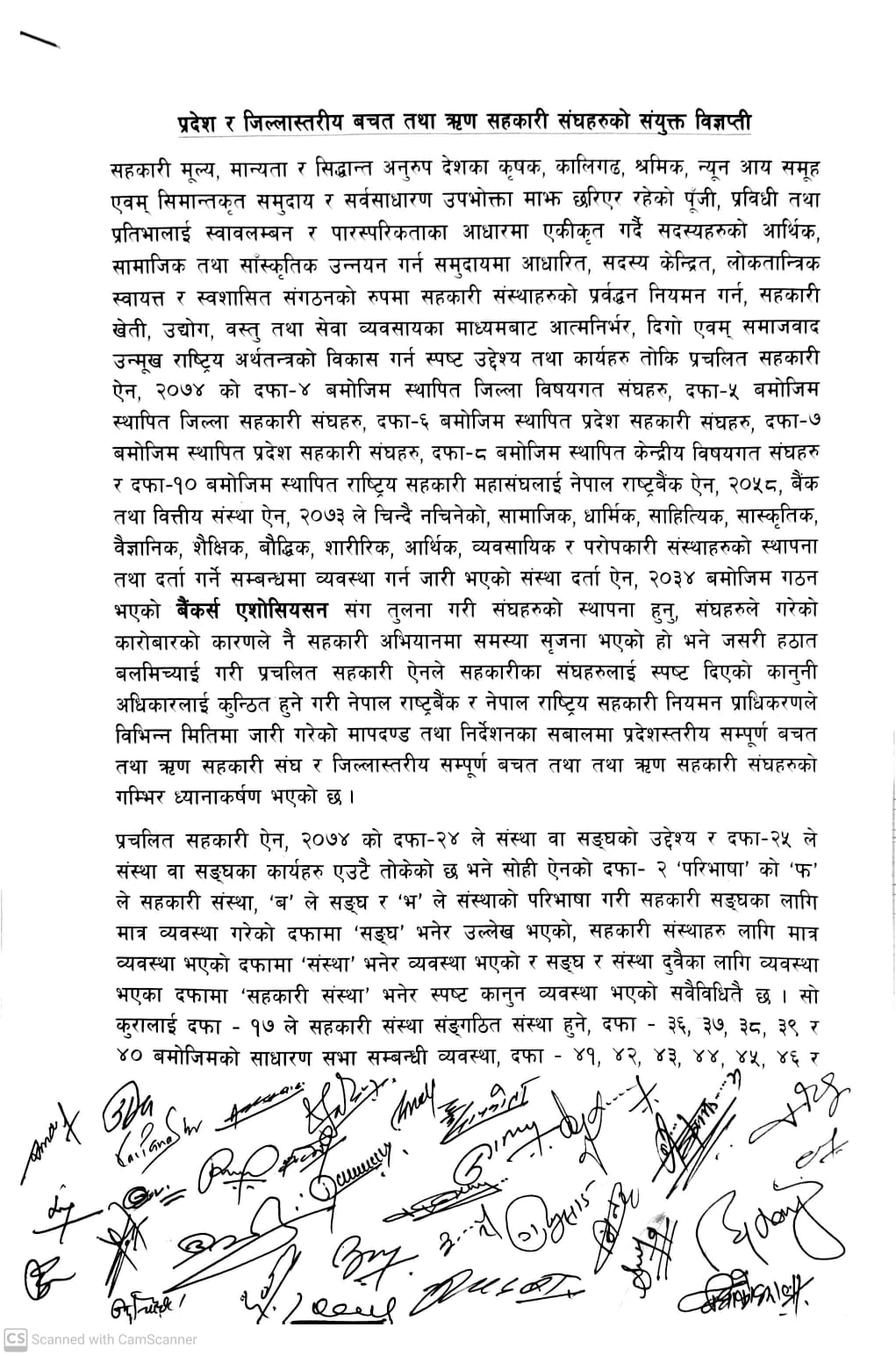 संघहरुले सहकारी ऐन २०७४ बमोजिम गर्दै आएको बचत तथा ऋणको कारोबार गर्न पाउनुपर्ने मागसहित हेटौंडामा भएको संयुक्त बैठकले संयुक्त विज्ञप्ती जारी गर्दै उक्त मापदण्ड र निर्देशनको कडा आपत्ति जनाउँदै आन्दोलनको चेतावनी दिएको हो । संघहरुले उक्त विज्ञप्ति राष्ट्रिय सहकारी नियमन प्राधिकरणका अध्यक्ष डा.खगराज शर्मालाई बुझाइएकोे छ।