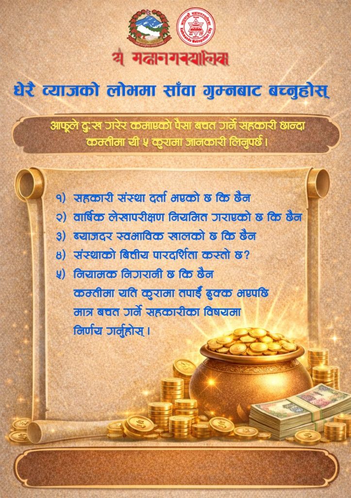 नागरिकलाई सुरक्षित बचत र जिम्मेवार आर्थिक निर्णयतर्फ प्रेरित गर्ने उद्देश्यले महानगरले यस्तो सन्देश सार्वजनिक गरेको जनाएको छ।